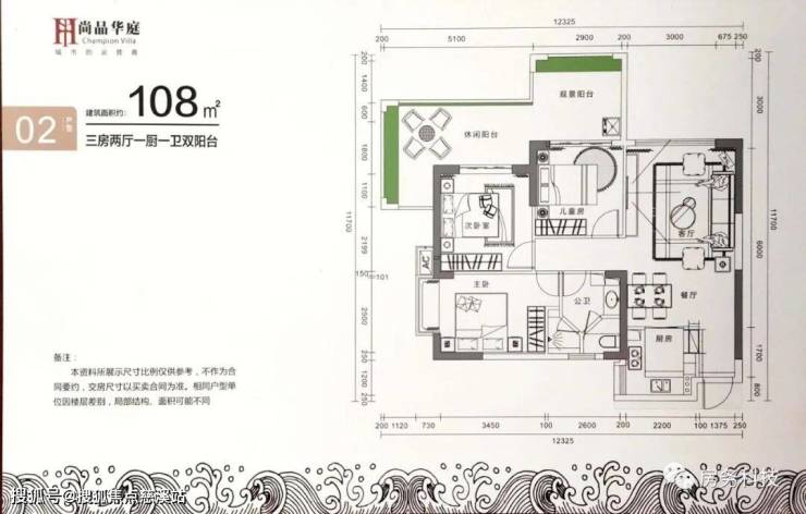 02户型 三房两厅一厨一卫双阳台 建筑面积为108㎡