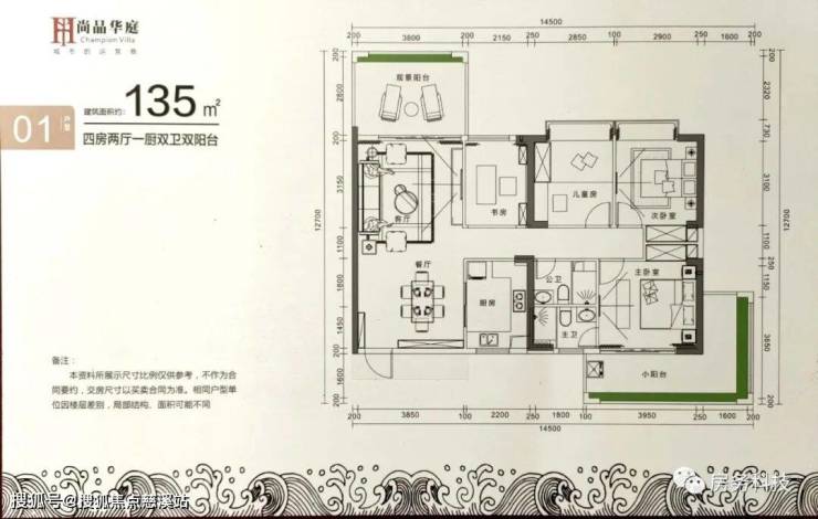 01户型 四房两厅一厨两卫双阳台 建筑面积为135㎡
