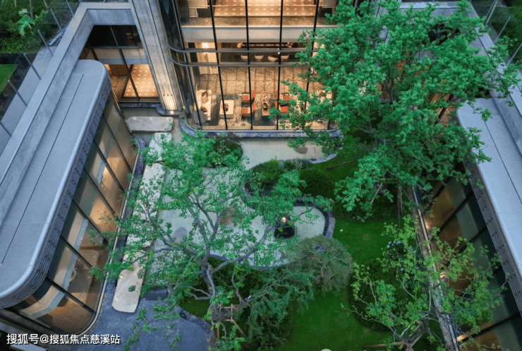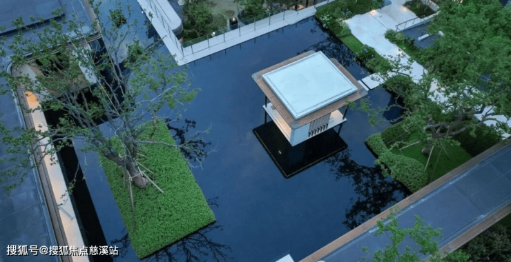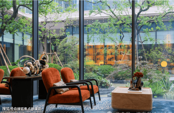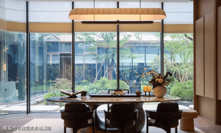 阔绰的川林水院,打破传统园林边界,构建了五重沉浸式景观序列:浮屿林地,绿岛错落隆起,野趣生境盎然;砚息客厅,休憩坐榻静候,树影婆娑中宜品茶观云;砚息回廊,勾连起移步换景的视觉动线;掬月水榭携无边镜池,倒映四季更迭;典藏乌桕虬枝探入水天,化作家家户户窗框里的鲜活艺术。