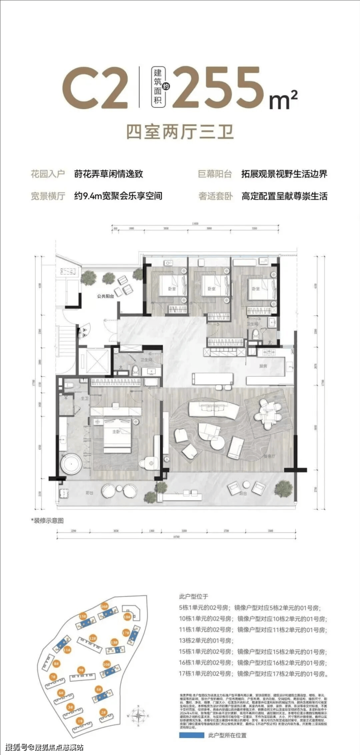 :约 9m 宽境横厅,解锁百变生活场景;环幕阳台设计,视野所及皆风光;奢适套卧带独立衣帽间,私享雅致时光;中西双厨配置,拓展餐厨功能体验。