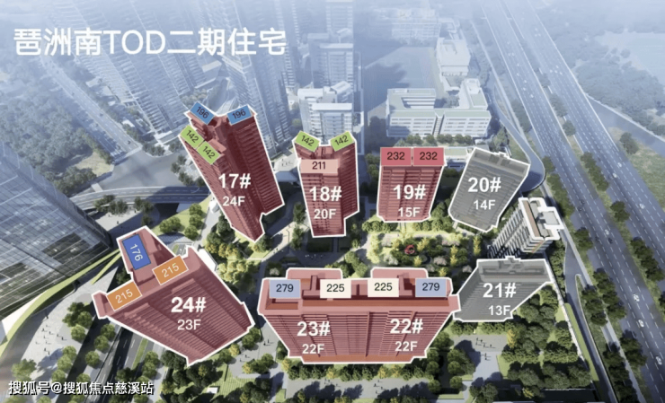 目前整个琶洲南TOD项目分两期开发,一二期总共将规划建设26栋楼,其中一期总共约1500户由16栋住宅和1栋公寓组成,二期总共约600户由8栋住宅和1栋公寓组成,并配建托儿所、幼儿园以及中小学等。