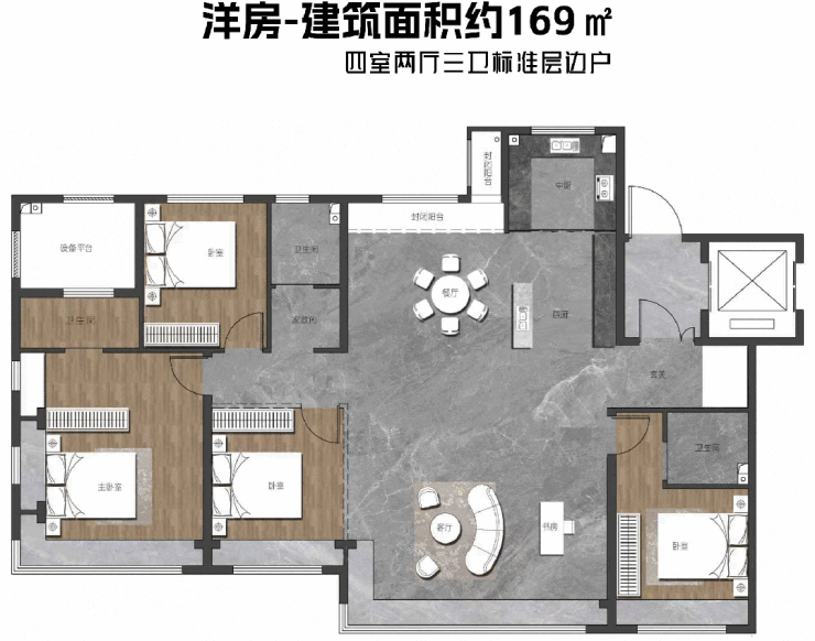 而建筑面积约169㎡户型,则将空间整合推向极致——客厅与餐厅、西厨融为一体,构成约6.3米×10.1米的巨厅格局。