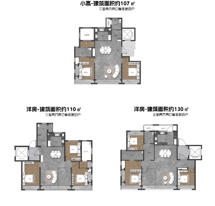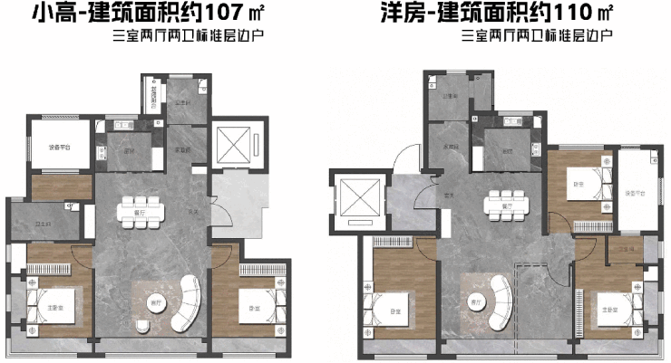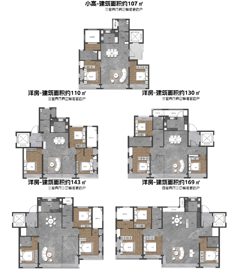 小高层户型为建筑面积约107㎡,洋房户型为建筑面积约110、130、143、169㎡,精装交付。