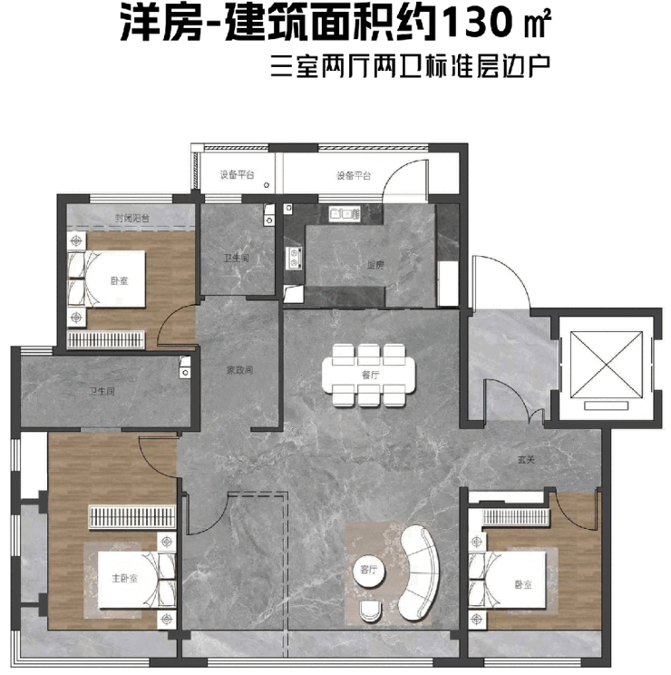 建筑面积约107㎡的小高层户型,采用了「两梯两户纯板式架构」,彻底告别传统两梯四户带连廊设计。