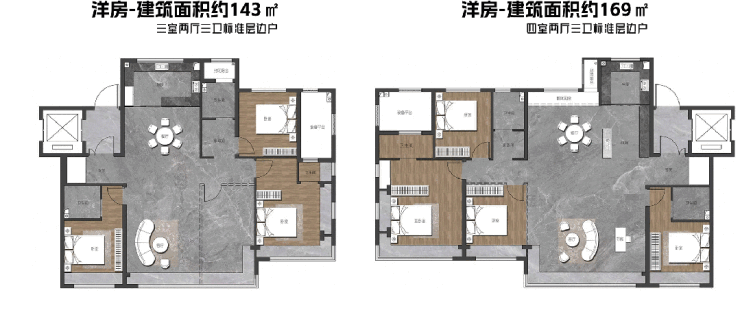 建筑面积约143、169㎡户型甚至在客厅也做了转角飘窗,实现「双转角」突破。