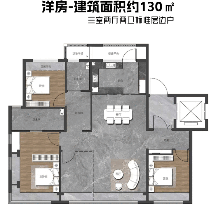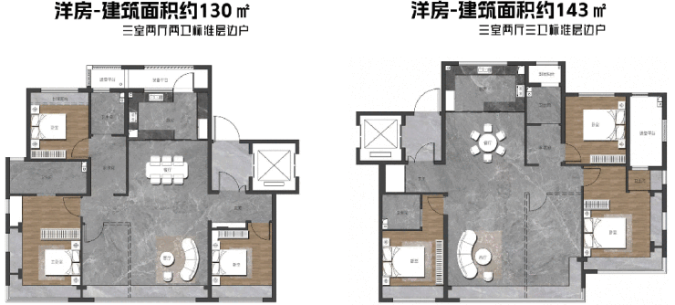 建筑面积约130㎡、143㎡户型,采取了当前市场上常见的「L」型客-餐-厨布局。