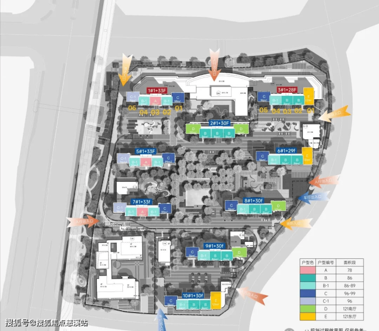 •绿化率: 36% ; •总户数:1380户;规划9栋29~34层超高层,2梯5户设计,楼间距:28~55米;车位:1426个;