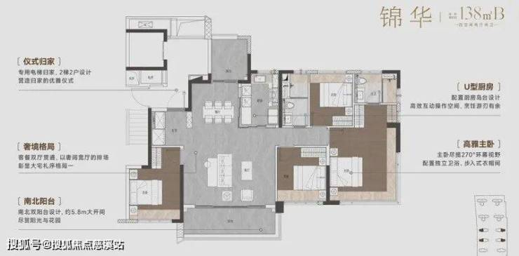 138㎡B户型则主打“尊贵感”,采用2T2户设计,专梯专户配置,业主可独享电梯厅空间,私密性与仪式感拉满。采光与视野极佳,整体居住体验堪比市面上160㎡的大平层。