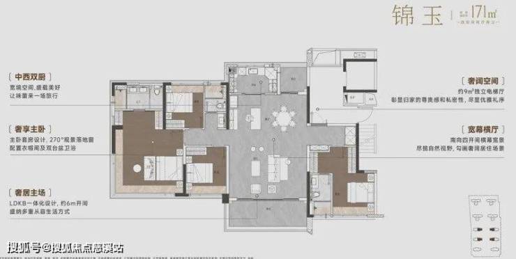 171㎡大平层则是终改人群的“理想之选”,2T2户设计,四房两卫格局,还配备双套房,尽显奢华。约9㎡的独立电梯厅与独立玄关,给予业主归家的第一重礼遇。公区采用LDKB一体化设计,厨房融合中西厨功能,满足不同烹饪需求,客厅开间约6米,连接景观阳台,俯瞰社区美景,气派十足。主卧更是豪华感爆棚,270°落地窗带来无敌视野,独立衣帽间与双台盆卫浴,让主人尽享品质生活。