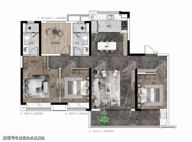 户型套内花园和阳台为半赠送,阳台长度横跨客厅和次卧,套内花园作为自主空间,业主可根据自身需求来打造空间;连个飘窗为全赠送,整体赠送率较高。