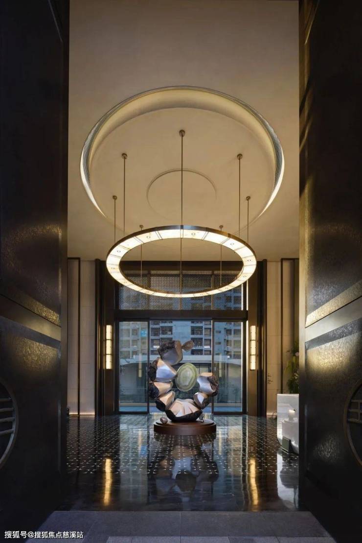 皇家白玉的仪式感:归家环岛前庭中央,整石切割的皇家白玉发光圆盘,形似平安扣,寓意“财运亨通”;7米高黄铜大门左右矗立四幅皇家白玉玉璧,晨光漫溢时,温润玉泽如神鹿衔星坠入凡尘。