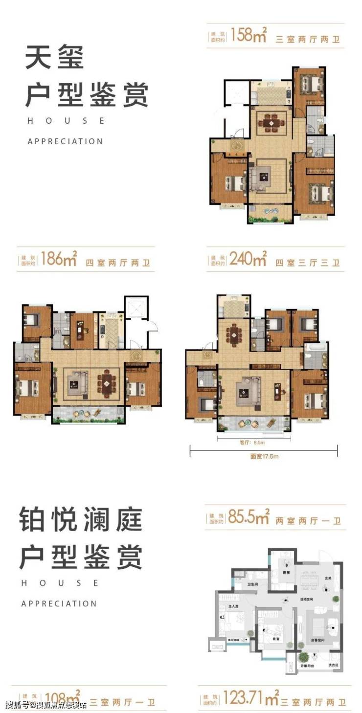天玺作为纯粹的高端改善产品,户型全部是建筑面积段约155㎡-240㎡的大三室、四室产品,全部为奢装交付。