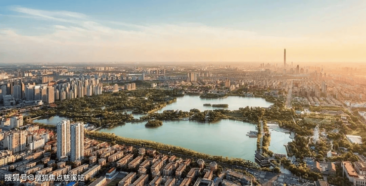 💠天塔湖⽣态公园-市中心地标湖景:天津市区中芯地带最⼤的⼈⼯湖,约6000m²喷泉广场、约3000m²紫金广场与地标天塔共塑独特休闲地标;