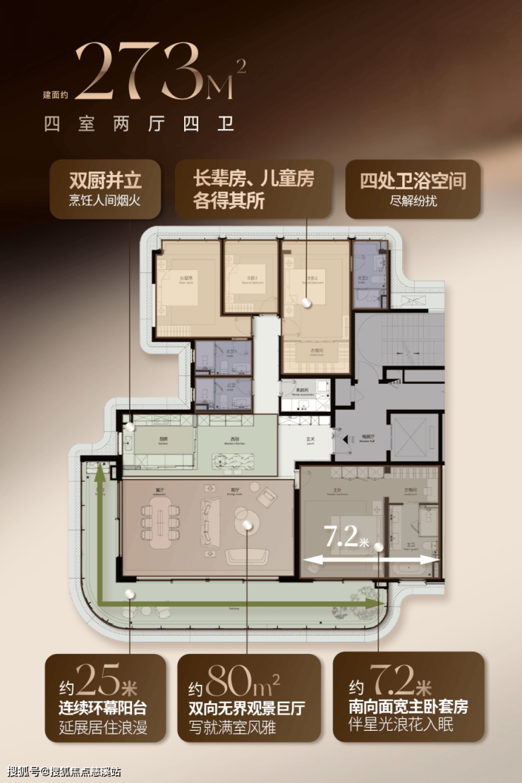 家族平层(建面约217-273㎡):以约10.8米南向超级横厅为核心,连接进深达2.4米的环幕阳台,形成IMAX级全景瞰海视野。空间布局充分考虑多代共居的需求,实现家庭成员亲密互动与独立私密的平衡,是传承与共融的家族主场。
