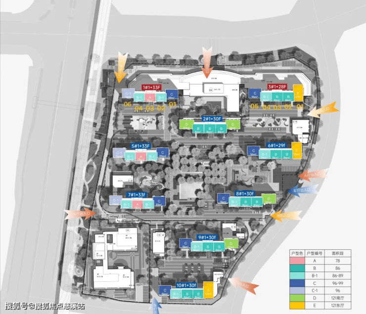 •绿化率: 36% ; •总户数:1380户;规划9栋29~34层超高层,2梯5户设计,楼间距:28~55米;车位:1426个;