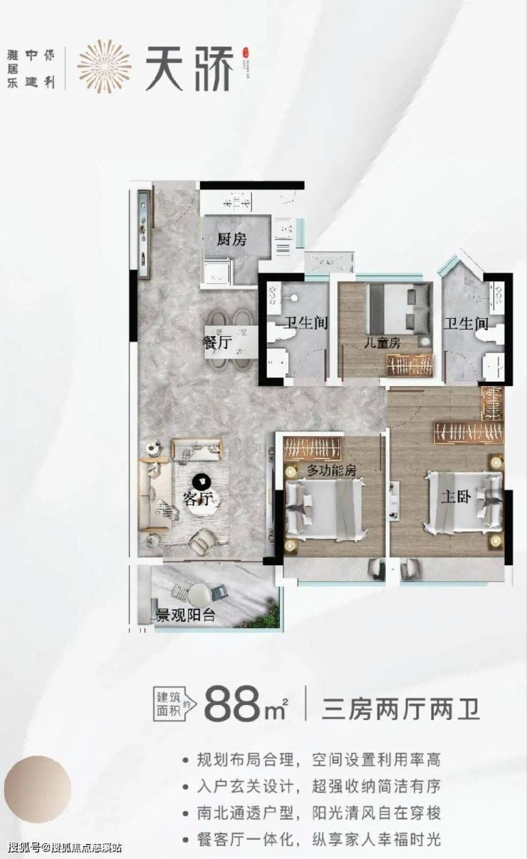 88㎡三房两厅两卫:南向三开间,主卧套房设计,U型厨房,总价约210万起。