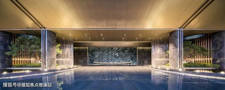 迎面约14.5米宽、4.9米高的液态大理石景墙,由全球罕见的西班牙马里奥纳灰奢石打造。