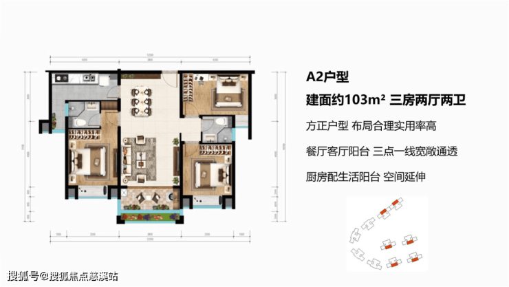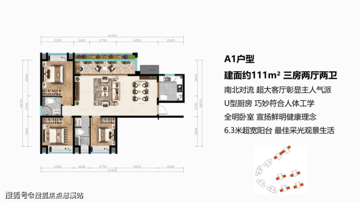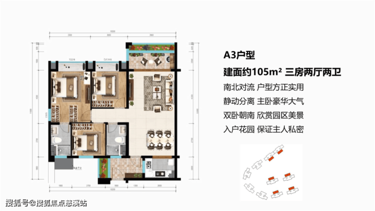 在售户型:A1户型111㎡ 3房2厅2卫、A2户型103㎡3房2厅2卫、A3户型105㎡3房2厅2卫