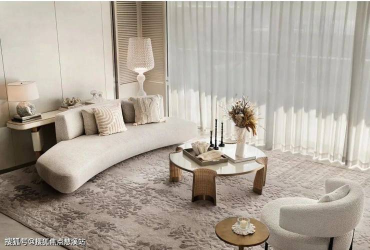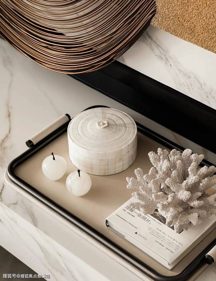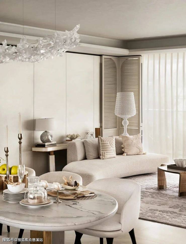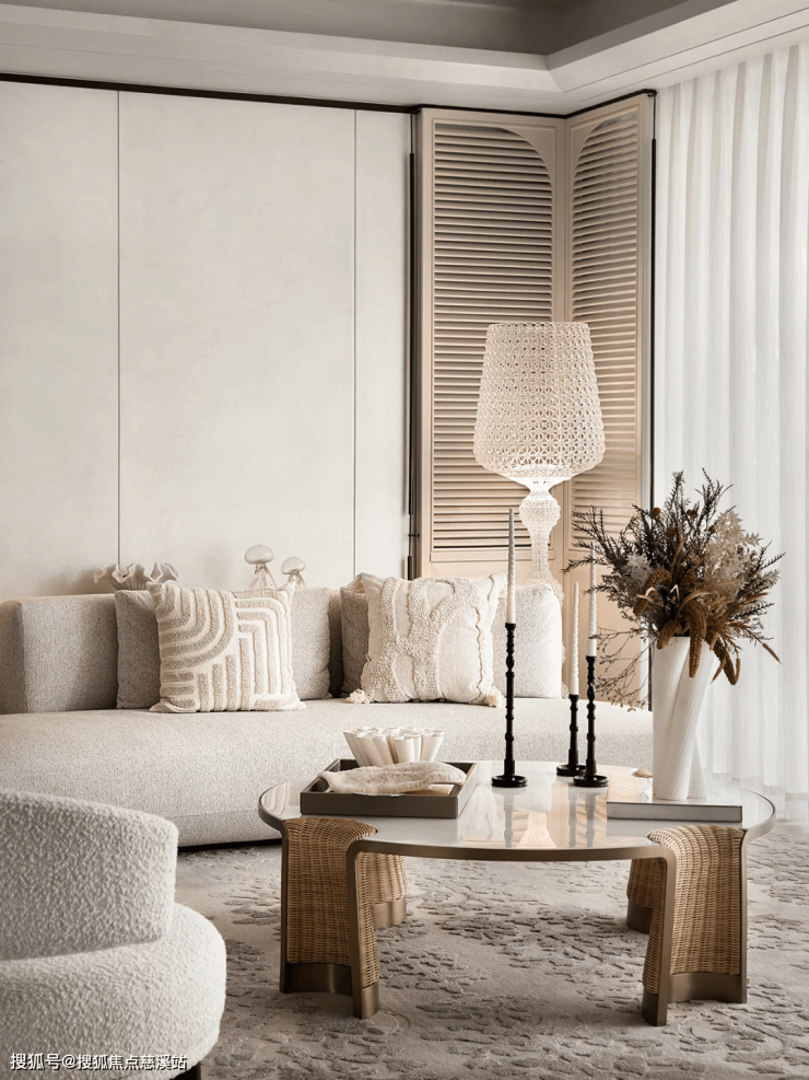 奶油色、浅米色与充满海洋元素的贝壳、绳结、海星等具有人文气息的手工艺术品点缀,将大海装进空间里。客厅的多人沙发Gallotti&Radice 、B&B休闲长凳、石材与金属相融合的藤编茶几,呈现出自然精致与现代交汇的流动美感,在静谧中透出一丝克制的奢华感。