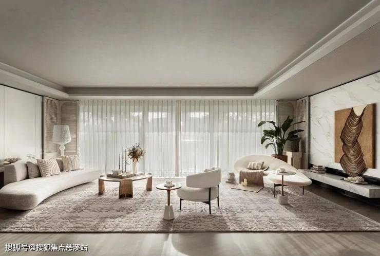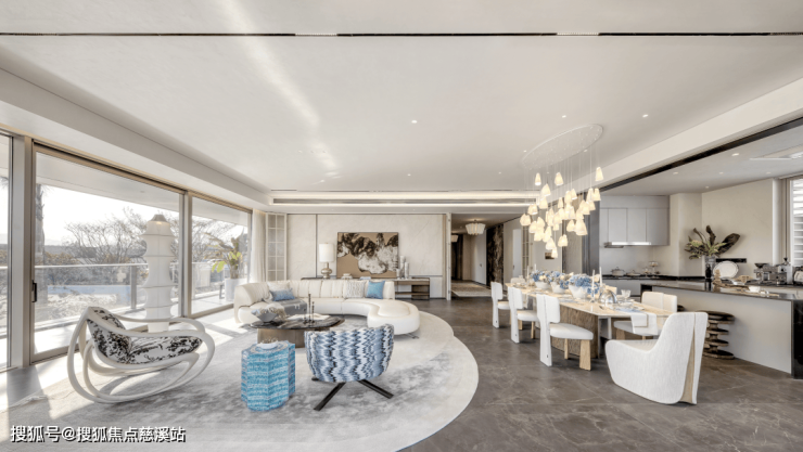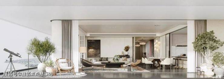 步入室内,就是约10㎡的私享电梯前厅,层高约3.5m,三面采光的公区,270°无柱环形端厅,延伸出约44米的观景面,尽显主人气场。