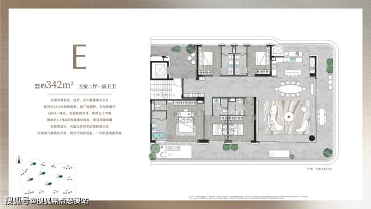 比如建面约342㎡户型,悬挑2.4米L型跑道式阳台,阔绰尺度,挑战极限。