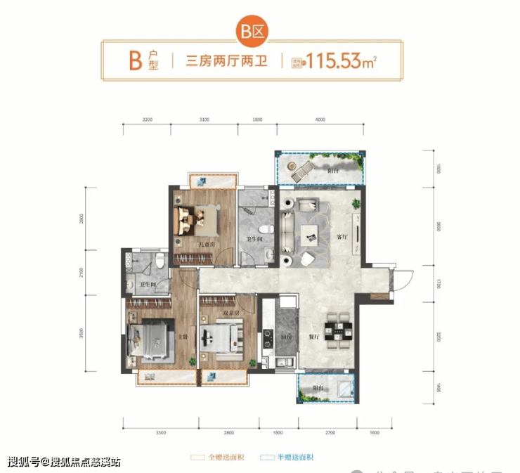 B户型:115平阳光3房,入户大玄关充沛收纳空间,双品质卫浴让生活更从容