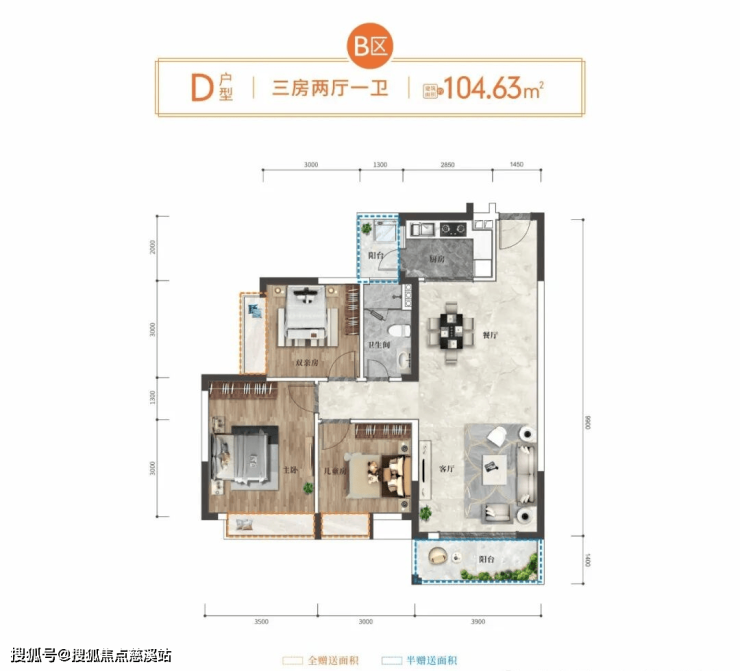 D户型:104平精致3房,奢阔双阳台安放生活与诗意,室室大飘窗百变功能随意造