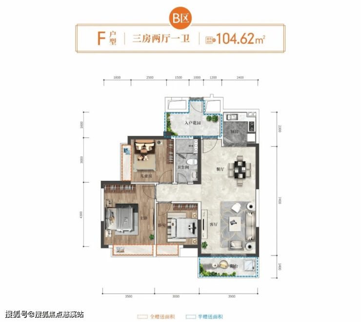 F户型:104平精致3房,全明通透通风赏景俱佳,双厅一体放大欢聚尺度