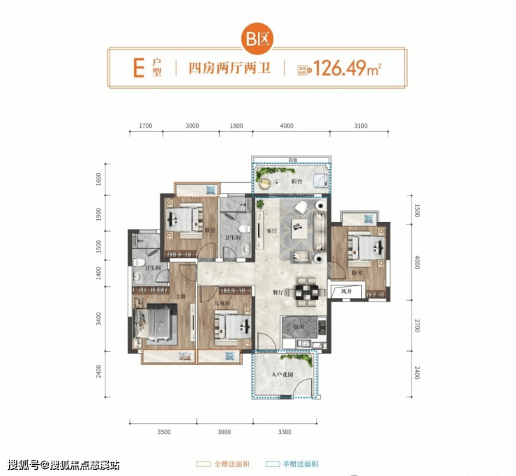 E户型:126平创享3+1房,南北通透阳光鲜氧,双厅一体纵享阔境排场