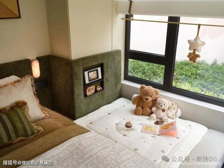 建面约92㎡户型全屋落地飘窗面积达约12㎡,其中的一个小细节:主卧的飘窗空间可打造为婴幼儿的陪护小床,更是充分的从业主使用需求进行设计与考量。