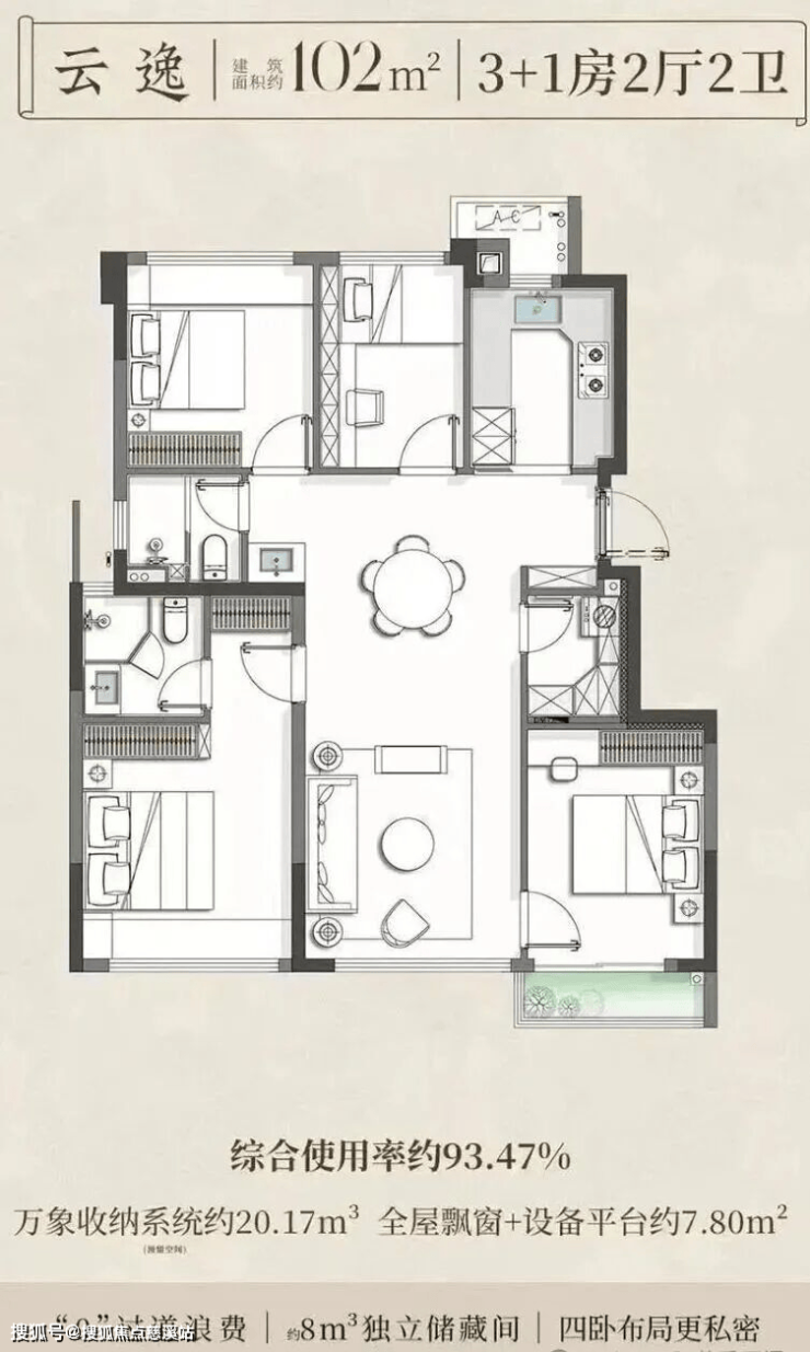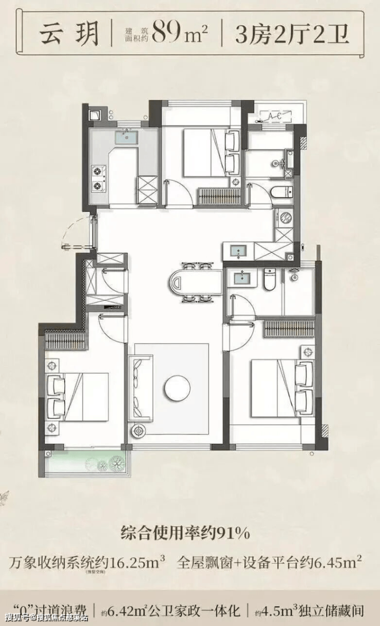 主力户型为89㎡、102㎡、113㎡,均为南北通透设计,部分户型配备独立储藏间和万象收纳系统,全屋收纳空间可达15.97立方米,满足家庭多样化需求。