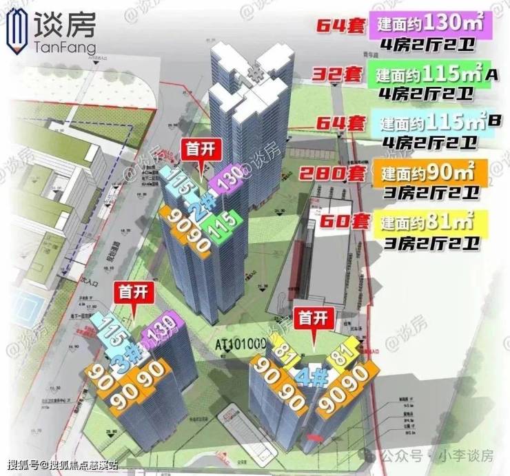项目的第二个卖点是户型,整体地块抬高设计,约100%实用率,还是实景准现楼,今年买今年住,在售户型包括北向的81方三房两卫,南向的90方三房两卫,南北对流的115方四房两卫,南北对流的130方四房两卫。