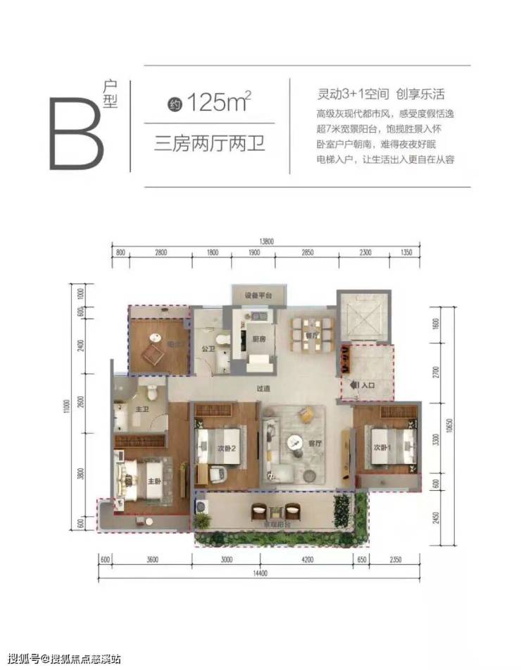 主力户型:建面约108m² 三房两厅两卫125m² 3+1房两厅两卫142㎡ 四房两厅两卫