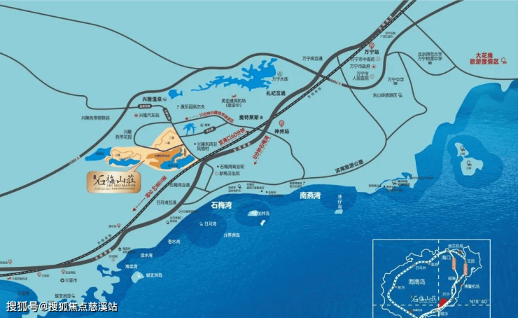 便捷交通:距高铁万宁站约19公里,距神州站仅约4公里;双出口接入海南环岛高速。高速、环岛、高铁、机场多维交通,玩转全岛。