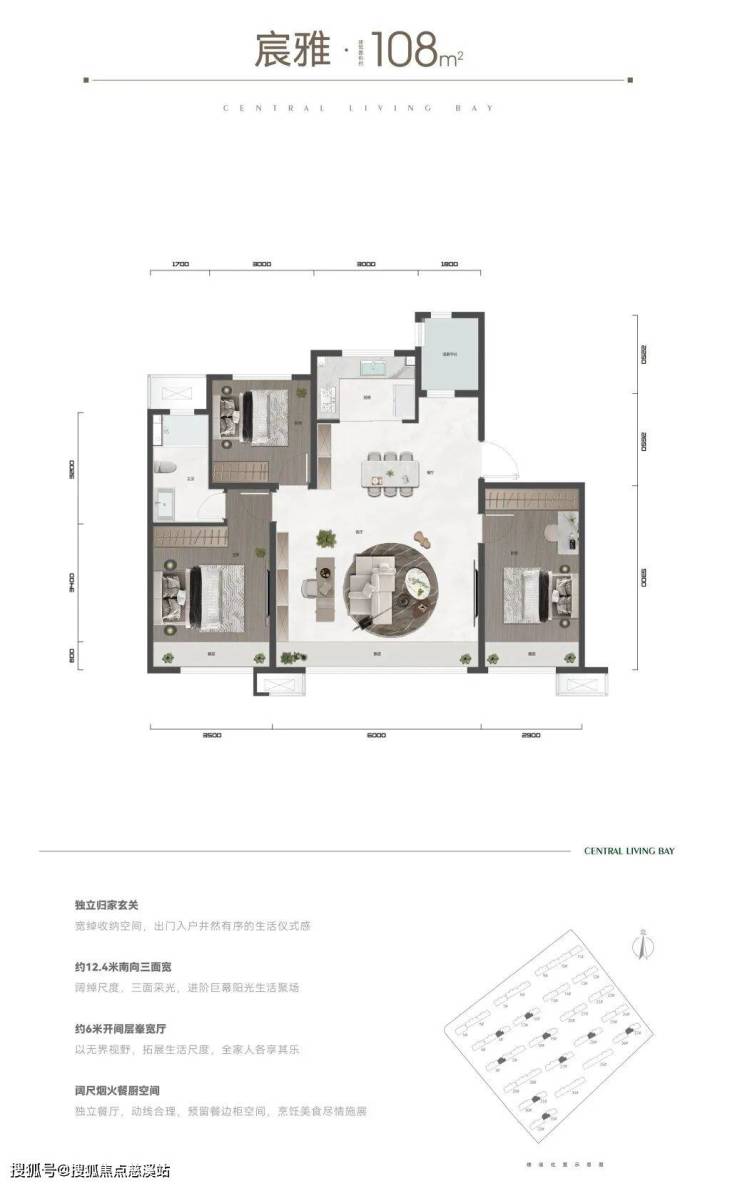 108㎡产品约12.4m南向三面宽,客厅开间为6m。