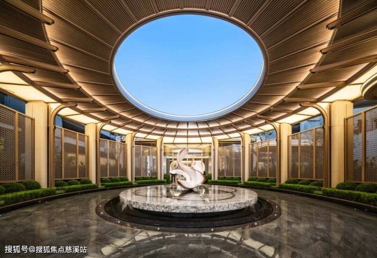 大门之后,是“棠庭邀月”主题艺术圆厅,也是归家礼序的二进空间,中间矗立一座海棠花瓣水景雕塑呼应项目“海棠系”产品。