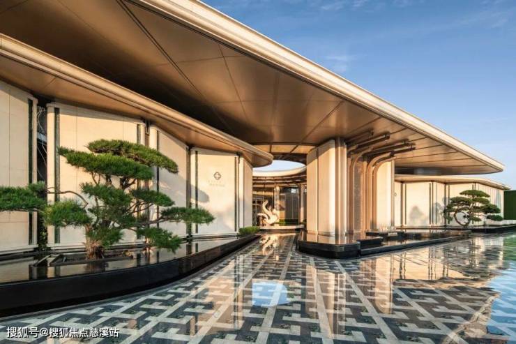 业主从踏上这个场域开始,就完成了空间的转换——从原本的城市界面,进入到由绿城·晓月熙棠营造的,五星级酒店般的度假生活。左右两棵冠幅、高度、云片完全对称的迎客松,让人一眼看去就会知道,这是一个很有价值感的社区。
