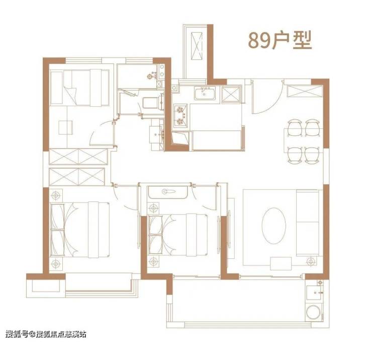 建面约89㎡三室两厅一卫,三开间朝南,整体户型十分方正。约5.8米的南向双阳台,可有效保证室内采光。厨房则采用了市面少有的灰玻进行隔断,增加空间感的同时也能与客厅更加良好的互动。而首付仅需75万起,更是打动了一众刚需客户,成为项目的爆款户型。