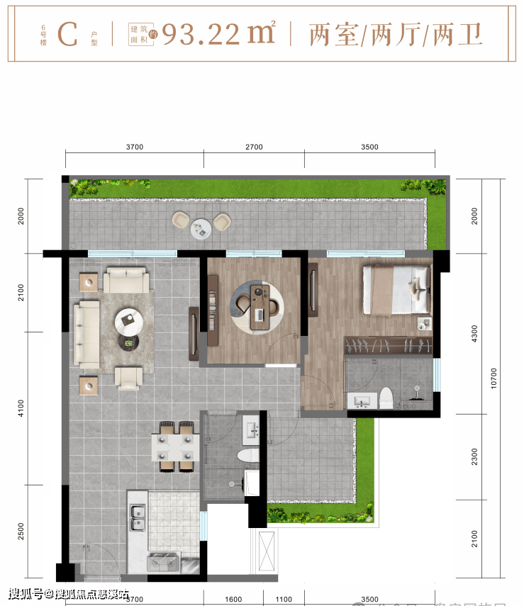 C户型:约93㎡舒阔两房两厅两卫,约10米面宽的景观阳台,横跨双卧一厅,纵享无边美景