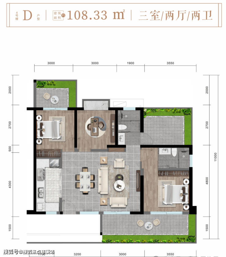 D户型:约108㎡全景三房房两厅两卫,三阳台臻稀户型,艺术空间组合序列,人性化精析设计,纵享更多起居空间