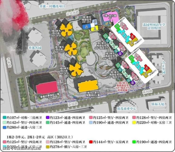 【新世界香蜜四季花园】前身为华泰旧改项目,项目总占地约4.64万㎡,建面约54.35万㎡,分为两个地块开发。03-02-05地块规划为公寓产品的【新世界香蜜国际公寓】,03-02-06地块则是【新世界香蜜四季家园】,未来将会打造成集住宅、商业、公寓、酒店等于一体的大型综合社区。