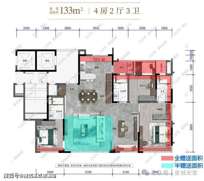 户型一:建面约133㎡,4房2厅3卫