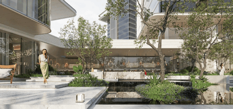 园林五重境:从社区大门超 40 米的贝金米黄石材门庭,到汀步花境、观澜水院等水系景观,步步皆景;