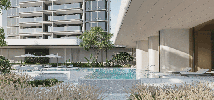 项目外立面采用 270° 弧形玻璃幕墙 + 金属线条设计,远远望去像一艘停泊在江岸的「未来之船」,尤其是头排 2/3/9 号楼的公建化立面,在阳光下折射出粼粼波光,与 250 米宽的东平河面完美呼应。
