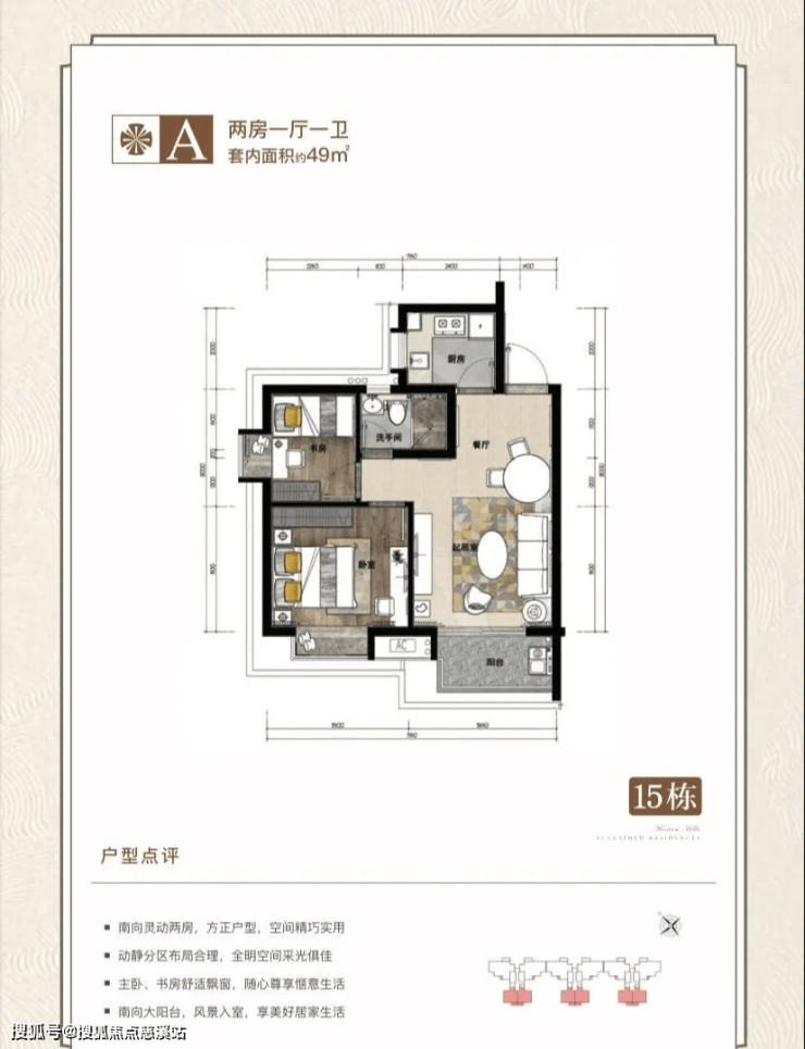 A型:两房一厅一卫,约49㎡,建筑面积63㎡