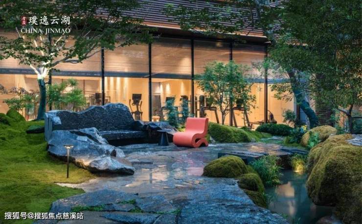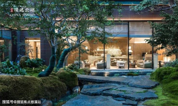 移步下沉庭院,叠瀑水景如脉络般串联起山、台、石、林、池,宛然一幅立体的水墨盆景跃然眼前。
