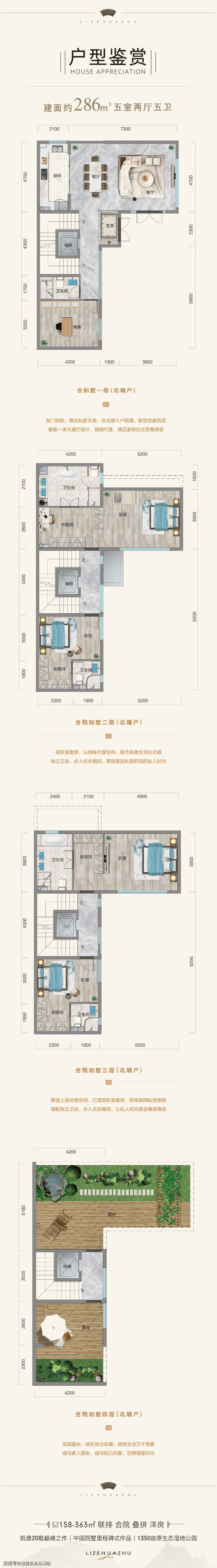 联排别墅:面积较大,如363㎡户型赠送南北双庭院,实用面积接近600㎡,总价约300万元起。