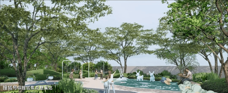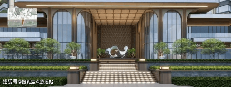 社区主入口林荫公园,9米高天际界面门楼,仪式水景岛,区内林溪水院,对景观山会客厅,营造城居五重领域归家仪式感。