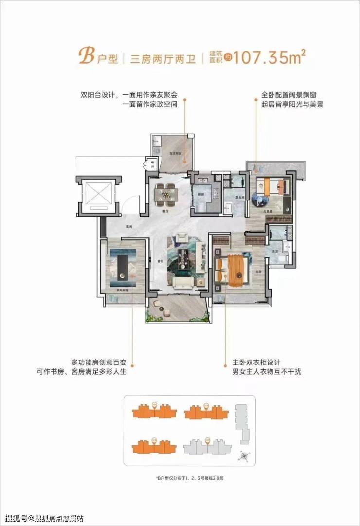 建面约107㎡三房(B户型):含玄关区、主卧套房、双阳台