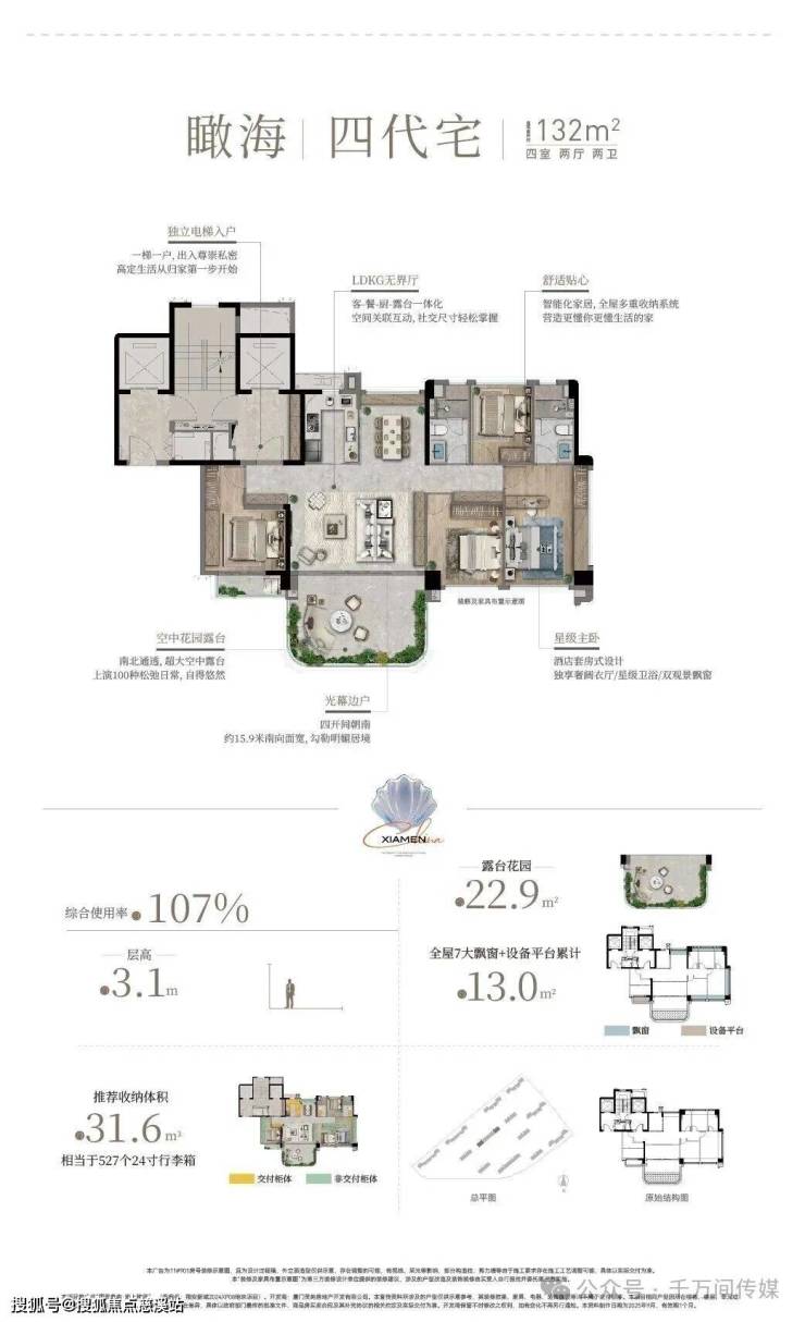 作为会展新城首个四代宅项目,海上雅颂主推78-132㎡三至四房,覆盖刚需、改善需求,整体得房率约84-107%。其中,高层层高约3米,四代宅层高约3.1米,整个空间感会更通透。